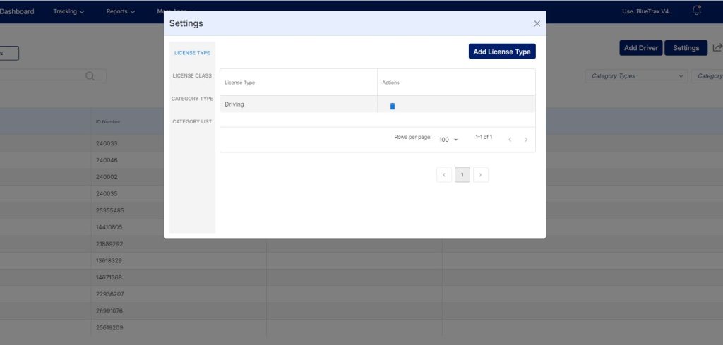 To add drive licenses, types, or classes, click the settings button at the top right of the drivers page. A window will appear, allowing you to manage these options.