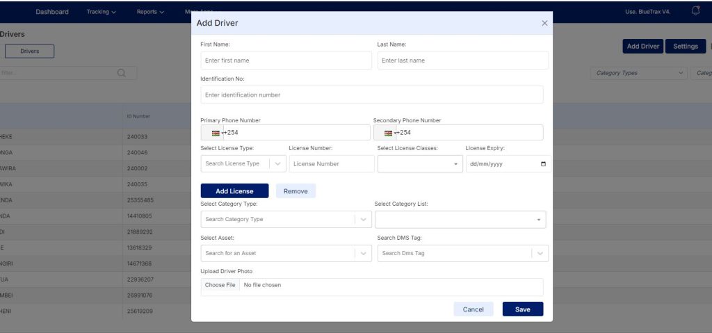 To add a driver, click on the Add Driver button at the top right. A window will appear that will allow you to fill in the details and click save.