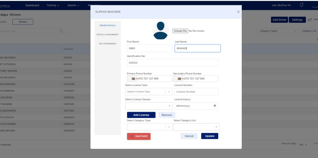 To edit and update driver details, click on the Driver that you want to edit. A window will appear that will allow you to edit the details of  details and click save.