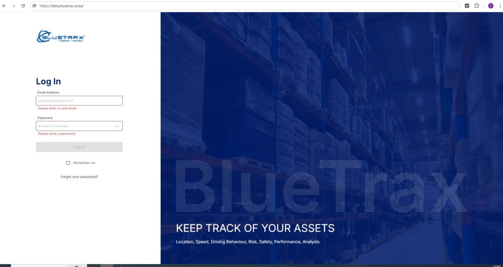 Log in Estimated reading: 1 minute 1085 views Welcome to Bluetrax v5.1 To login to BlueTrax version 5.1, go to your browser and navigate to https://bluetrax.co.ke Tagged:Doc