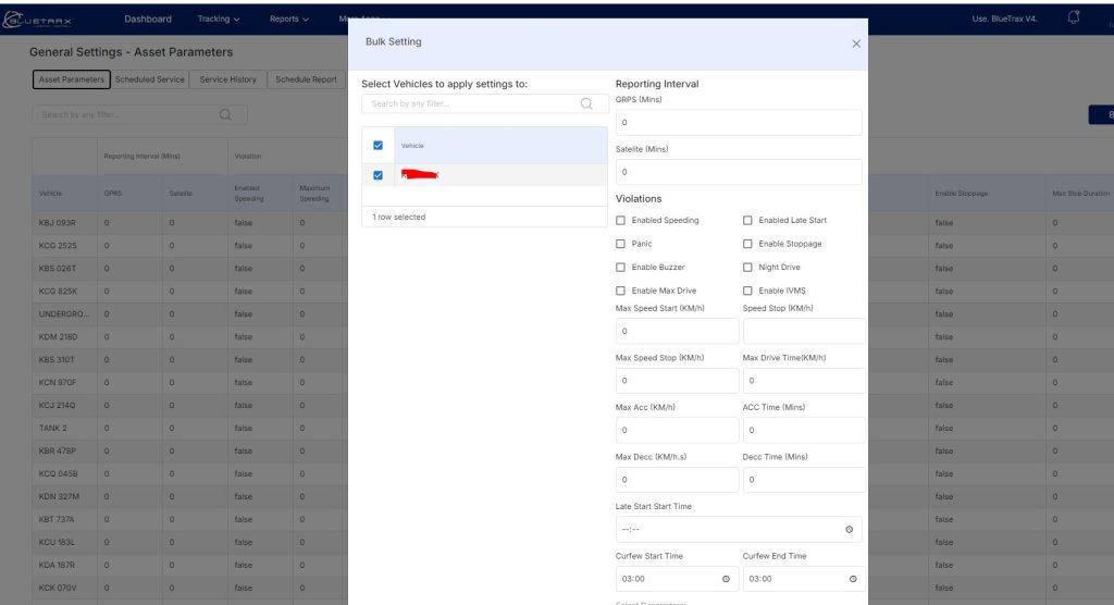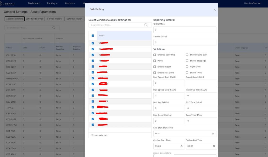You can adjust transmission intervals, speed limits, stoppage limits, night drive limits, harsh braking, harsh acceleration, curfews, buzzer settings, and more.