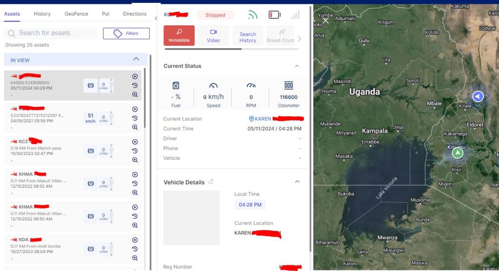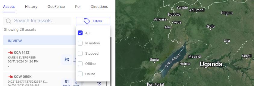The Assets page allows you to track and monitor your assets. It has sub modules such as Assets, History, GeoFence, Poi and Directions