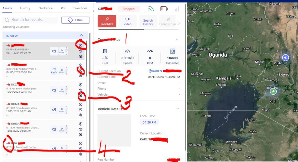 The icon at the top of the last three icons (labeled 1) allows you to live track the asset, enabling close monitoring of its movement with no other assets on the screen.